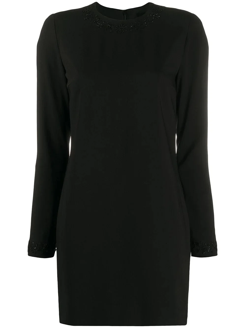 beaded mini dress Until they make a colour darker than black, we're sticking with it. Redefining the meaning of the LBD, this black cotton-blend mini dress from DSQUARED2 is decorated with floral beaded detailing to the collar and cuffs. Subtle yet classy. Featuring a round neck, long sleeves and a rear zip fastening. Made in Italy Composition Viscose 59%, Cotton 38%, Spandex/Elastane 3% SIZE & FIT Model measurements Height 5 ft 9 in(1.75 m) Bust/Chest 32.67 in(83 cm) Hips 36.22 in(92 cm) Waist 24.8 in(63 cm) Washing instructions Dry Clean Only