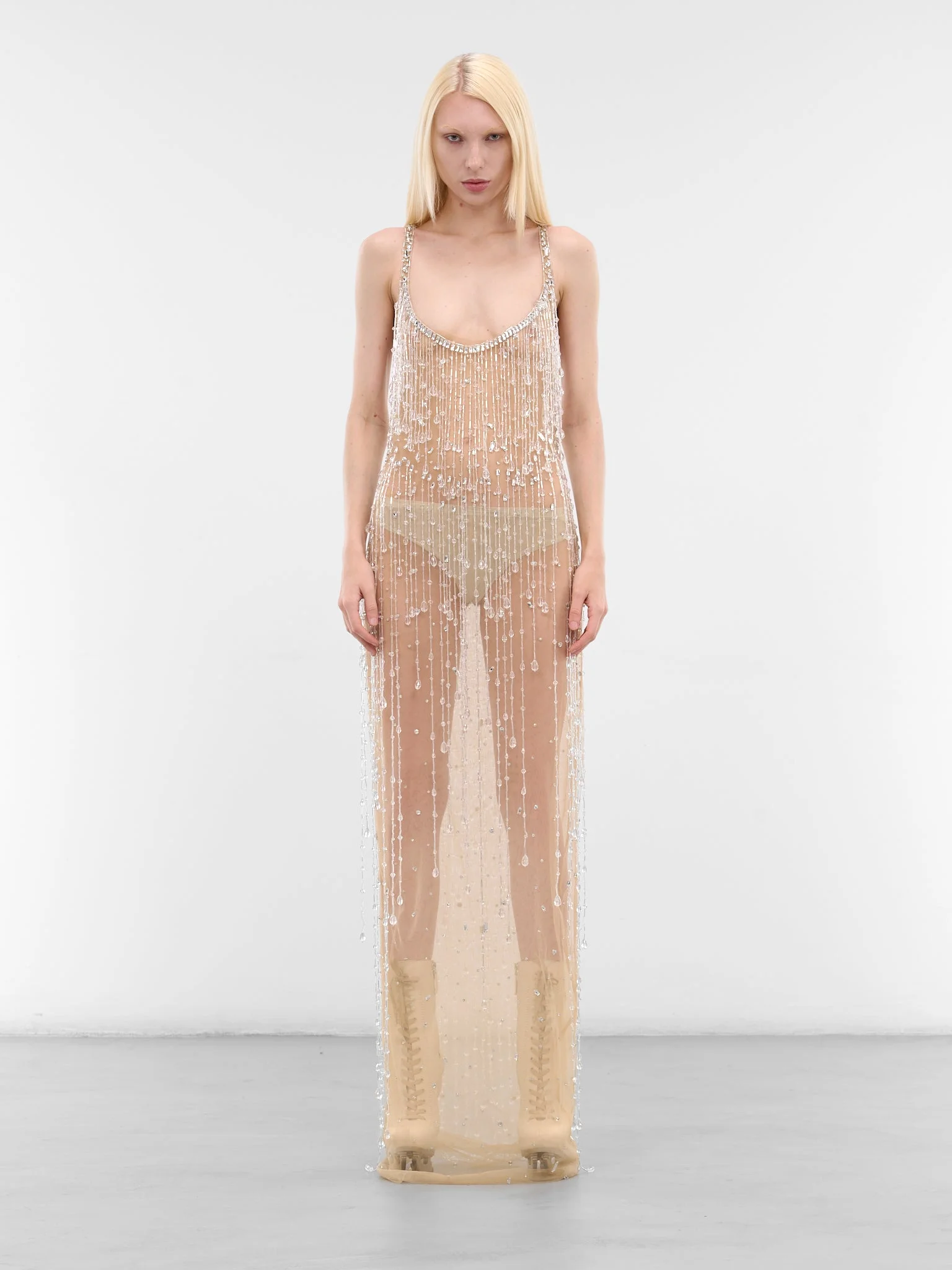 Beige sheer dress in poly mesh with rhinestone and bead fringe embellishment throughout, cut to floor length with a racerback and partially open back. Featuring: • Slim fit • Sheer poly mesh construction • Rhinestone and bead fringe embellishment • Scoop neck with shoulder straps • Sleeveless • Racerback with partially open back • Floor-length • Made in Italy • Main: 100% Polyester | Embroidery: 100% VTR • Italian sizing Model is 5'9" wearing size 40. Bust: 32" Waist: 25" Hips: 34"