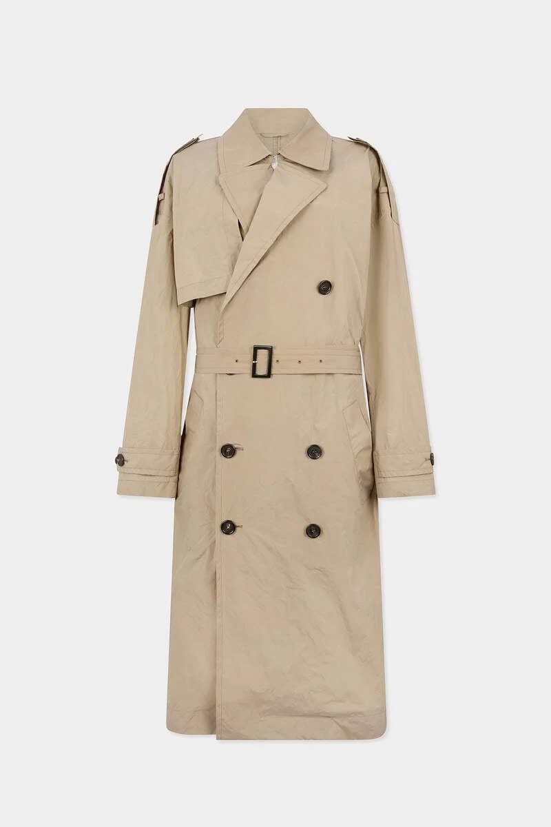 - PRODUCT ID : S75AH0104S52115160 - MADE FROM TAFFETA - LAPEL COLLAR - DOUBLE-BREASTED CLOSURE - ADJUSTABLE INTEGRATED BELT - SHOULDER AND CUFF TABS - BACK STORM FLAP - BACK VENT PRIMARY FABRIC: 68% POLYESTER, 32% POLYAMIDE-NYLON Crisp and contemporary, this trench coat is cut from technical taffeta in an oversized fit and finished with all the classic details, like a tonal belt, buttoned front and wide lapels. The paper-effect fabric adds an unexpected twist.