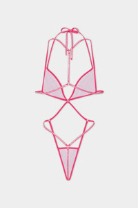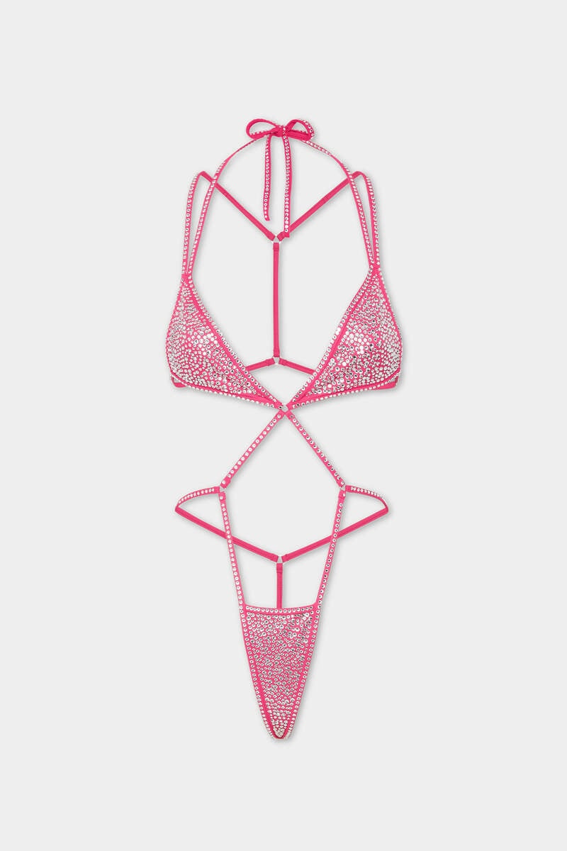 - MADE FROM LYCRA - METAL STUDS - MULTI-STRAP DESIGN 80% POLYAMIDE, 20% ELASTANE Prepare to turn heads this summer in this statement multi-strap swimsuit, encrusted all-over with delicate metal studs. The back is all straps and no coverage: because sometimes less is more.