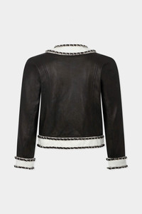 - PRODUCT ID : S72AM1136SX9749900 - MADE FROM LEATHER - CREW NECK - BUTTON CLOSURE - BUTTONED POCKETS - CHAINS PRIMARY FABRIC: 100% CALF LEATHER; LEATHER: 100% CALF LEATHER; LINING: 60% VISCOSE-RAYON, 40% POLYESTER Made to rebel. This sharp leather jacket is defined by contrasting leather cuffs and woven edging that frame its sleek silhouette. Balancing attitude and elegance, style it with a tank top and denim hot pants for the chic rebel in you.