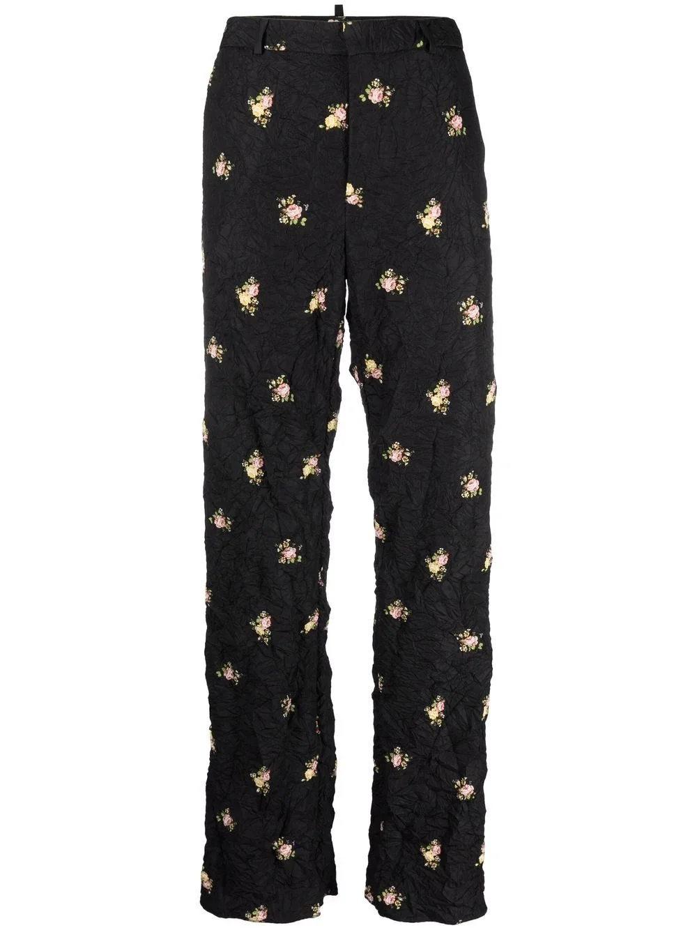 creased floral-print trousers black/multicolour all-over floral print crease effect belt loops straight leg Made in Italy Composition Lining: Polyester 100% Outer: Polyester 100% SIZE & FIT Model measurements Height 5 ft 10 in(1.78 m) Bust/Chest 32.67 in(83 cm) Hips 35.82 in(91 cm) Waist 24.01 in(61 cm) FittingInformation This piece fits true to size. We recommend you get your regular size Designed to be fitted at the waist and hips, loose over the leg Made with a lightweight non-stretch fabric Washing instructions Hand Wash