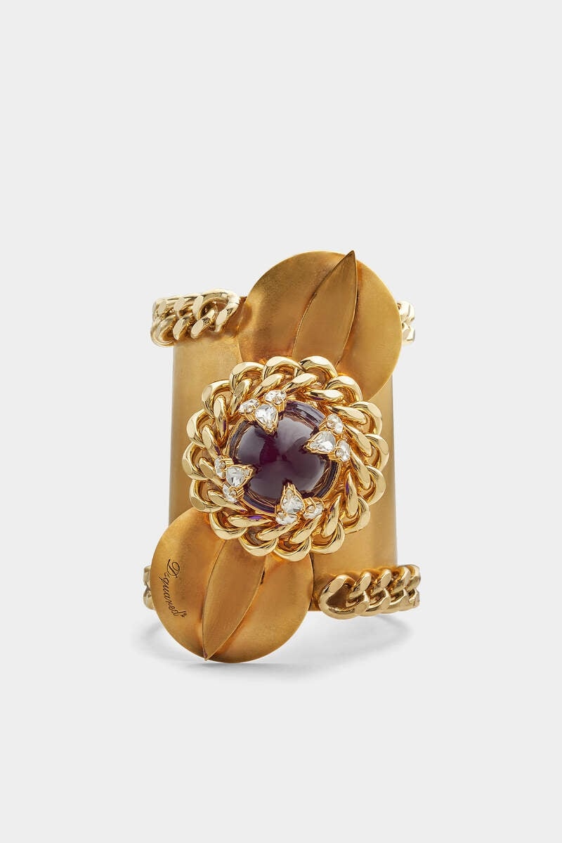 - PRODUCT ID: ARW021113420001M3019 - BRASS CUFF BRACELET - DECORATIVE CHAINS AND COLORED STONES - MADE IN ITALY STRUCT: 80% BRASS, 20% GLASS This richly decorated cuff bracelet is perfect if you’re into non-classic looks. It’s better worn on its own for it's so defining that it needs no sidekicks.