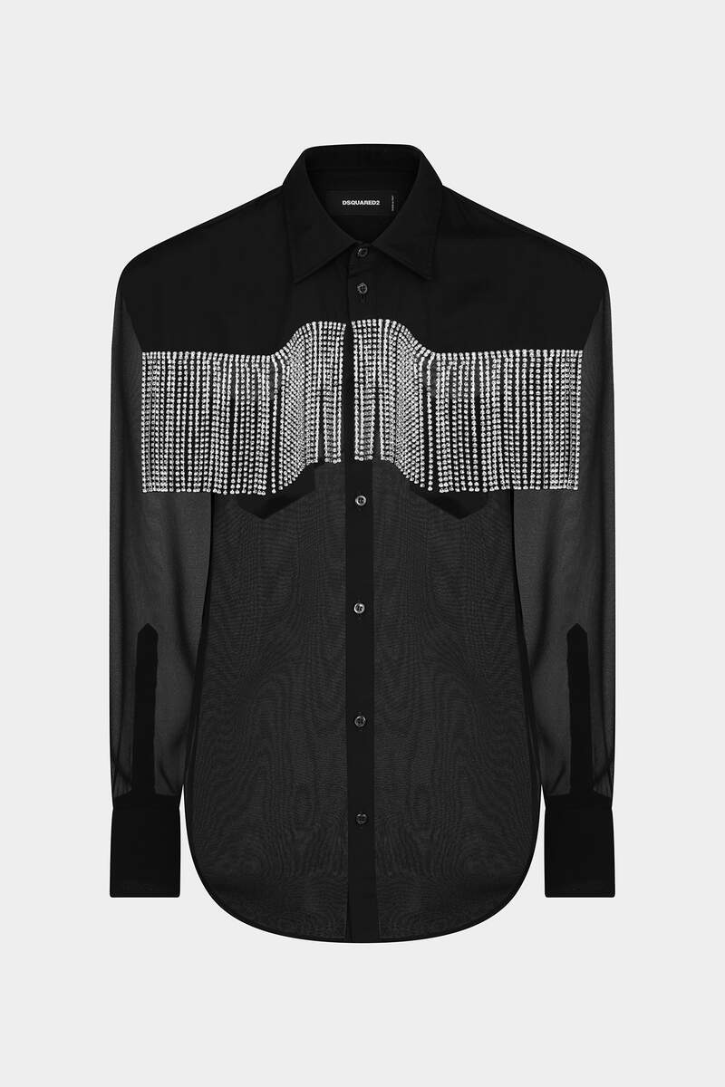 ● PRODUCT ID: S75DL0877S78533900 ● COTTON POPLIN AND POLYESTER VOILE SHIRT ● APPLIQUÉ CRYSTAL TASSELS ● POINTED COLLAR ● SHOULDERS WITH CONCEALED PADDING ● YOKE WITH BOX PLEAT ● ROUNDED HEM ● OVERSIZED FIT ● MADE IN ITALY ● FABRIC 1: 100% POLYESTER ● FABRIC 2: 100% COTTON Western references with a glam vibe are the hallmark of this poplin shirt which focuses attention on the upper part, where there are padded shoulders and a yoke with crystal fringe appliqué. To complete the look, tight-fitting imitation leather trousers or a five-pocket denim jacket with a jewelled belt will be perfect.