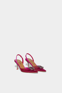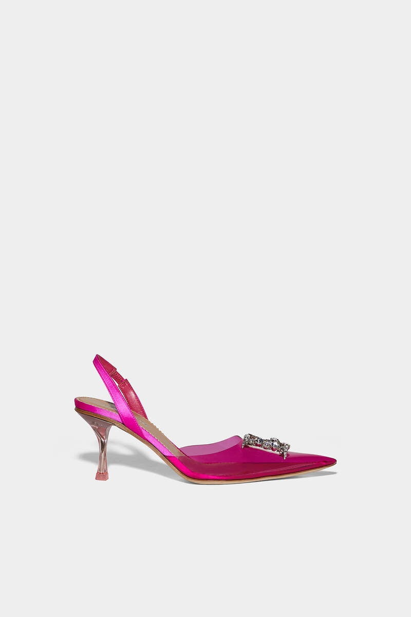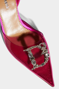 - PRODUCT ID: PBW0014358015729217 - PVC AND SILK SLINGBACKS WITH LEATHER DETAILS - RHINESTONE-EMBELLISHED METAL "D2" DETAIL - "DSQUARED2” LETTERING ON THE FOOTBED - ELASTICATED SLINGBACK STRAP - STILETTO HEEL - MADE IN ITALY UPPER: 90% PVC, 3% SILK, 7% VISCOSE. LINING: 100% SHEARLING. SOLE: 100% LEATHER Make a statement with these stunning Dsquared2 women's shoes. The high-heeled silhouette features a vamp that tapers to a pointed toe box, creating a sleek and sophisticated look. The six-inch heels are made from a glass-like material, adding a touch of glamour to any outfit. The ankle strap provides extra support and security, making these shoes perfect for any occasion. Pair these shoes with a sleek and form-fitting evening gown for a chic and sophisticated look.
