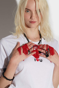 - PRODUCT ID: S75GD0335S23009100 - COTTON JERSEY CREW-NECK T-SHIRT - REGULAR FIT - FRONT BEADED TASSEL HEART WITH LETTERING - REAR MINI "DSQUARED2" PRINT - MADE IN ITALY PRIMARY FABRIC: 100% COTTON. SECONDARY FABRIC: 100% COTTON Surprise your loved ones by swooshing the cleverly-constructed beaded heart fringe to reveal a little message on this sweatshirt! Throw on with your favourite jeans to create an instant laid-back outfit.