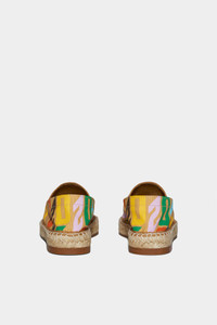 - PRODUCT ID: ESW001525406156M2546 - ORGANIC COTTON CANVAS ESPADRILLES - MULTICOLOURED "D2” PRINT - EMBROIDERED "DSQUARED2" LETTERING - WOVEN JUTE AND RUBBER SOLE - MADE IN SPAIN UPPER: 100% ORGANIC COTTON. LINING: 100% ORGANIC COTTON. SOLE: 30% ELASTODIENE, 70% JUTE The Dsquared2 shoe is a must-have for any shoe enthusiast. The two-tone design features an upper and sole in contrasting colours, making a statement with every step. The upper front is adorned with the brand's iconic "D2" monogram pattern, adding a touch of branding to the design. The insole features a leather patch with the brand's logo, adding a touch of luxury to the shoe. The sole has a distinctive woven, basket-like texture, adding a touch of texture to the overall design. For a more casual look, pair them with a pair of distressed jeans and a simple t-shirt.