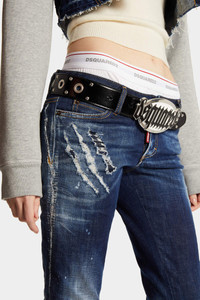 - PRODUCT ID: S75LB0943S30342470 - STRETCH DENIM 5 POCKET PANTS - WASH: USED WITH WEAR-AND-TEAR AND RIPS - SINGLE BUTTON WAISTBAND - LOGOED LABEL SEWN ON THE FLY - LEATHER LABEL SEWN ON THE BACK - CONTRASTING TWO-NEEDLE STITCHING - FIT: SKINNY - MADE IN ITALY FABRIC: 98% COTTON, 2% ELASTANE APPLICATION 100% CALF LEATHER Five-pocket jeans in a skinny version can become a second skin. The version with wear suggests wearing it on special events. To make it even cooler why not pair it with bustier shirts or satin jackets? To slender the silhouette more a 12 heel is a must.