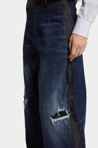 - MADE FROM STRETCH COTTON DENIM - WHISKERING AND DISTRESSED DETAILING - TUXEDO FABRIC ACCENTS - WAISTBAND WITH BELT LOOPS - SLANT POCKETS - BACK WELT POCKETS - METAL LOGO PLAQUE PRIMARY FABRIC: 99% COTTON, 1% ELASTANE-SPANDEX; SECONDARY FABRIC: 100% SILK; POCKET LINING: 100% POLYESTER; APPLICATION: 100% COTTON; APPLICATION: 100% POLYESTER Embrace easy-going eveningwear in these hybrid palazzo trousers, juxtaposing destroyed blue denim with tuxedo details in a statement mash-up of styles. Offset their rugged allure with barely-there stiletto sandals.