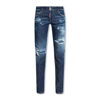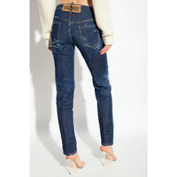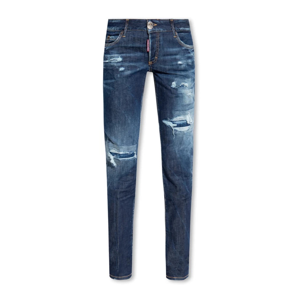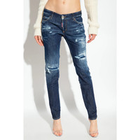 Dark blue ‘Jennifer’ jeans from Dsquared2. Cut with a low-rise waist, this pair falls with tapered legs and features a logo label on the front, button fastenings and the brand's signature distressed detailing.Model's MeasurementsHeight: 177cmBust: 83cmWaist: 61cmHips: 89cmModel is wearing size: 40 Designer color: Blue Designer ID: S72LB0657 S30789-470 Material & Care 92% Cotton 6% Elastomultiester 2% Elastane