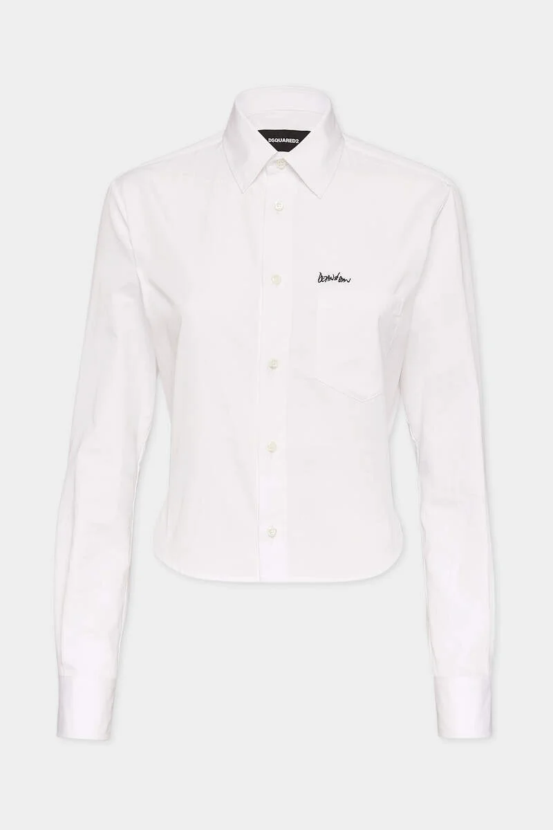 - PRODUCT ID: S75DL0676S36275100 - COTTON POPLIN SHIRT - BREAST POCKET - LETTERING EMBROIDERED AT LEFT CHEST - FIT: CROPPED SLIM - BUTTON FASTENING - STRAIGHT POINT COLLAR - REAR PLEATED - CURVED HEM - MADE IN ITALY FABRIC: 100% COTTON Dsquared2 reinterprets the white poplin shirt in a current and fresh version. The cropped fit suggests wearing low-waisted jeans with major buckle belts. A pair of cowboy boots are highly recommended.