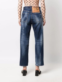 distressed high-waisted jeans dark blue straight leg cropped high-waisted distressed effect belt loops classic five pockets logo patch to the rear Imported Composition Outer: Cellulose 100%, Cotton 92%, Polyester 6%, Spandex/Elastane 2% Lining: Polyester 65%, Cotton 35% SIZE & FIT Model measurements Height 5 ft 10 in(1.77 m) Bust/Chest 35.03 in(89 cm) Hips 35.03 in(89 cm) Waist 23.62 in(60 cm) FittingInformation This piece fits true to size. We recommend you get your regular size Designed to be fitted at the waist and hips, loose over the leg Made with a mid-weight stretch fabric Washing instructions Machine Wash