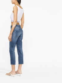 distressed slim-fit cropped jeans Cut to a cropped length for a modern look, these slim-fit jeans from Dsquared2 are presented in an indigo blue colourway with a stonewashed effect. The pair boasts distressed ripped detailing and is finished with a green logo patch on the rear. Highlights - Indigo blue - Stretch-cotton - Stonewashed - Distressed finish - Ripped detailing - Logo patch to the rear - Mid-rise - Belt loops - Front button and zip fastening - Classic five pockets - Slim cut - Cropped leg Made in Italy Composition Outer: Cotton 98%, Spandex/Elastane 2% Lining: Polyester 65%, Cotton 35% SIZE & FIT Model measurements Height 5 ft 10 in(1.77 m) Bust/Chest 32.67 in(83 cm) Hips 35.43 in(90 cm) Waist 23.62 in(60 cm) FittingInformation Designed for a skinny fit, these jeans offer a close fit throughout Cropped in length Constructed from stretch denim, this piece offers a stretch fit with durability This piece fits true to size – take your usual size Washing instructions Machine Wash