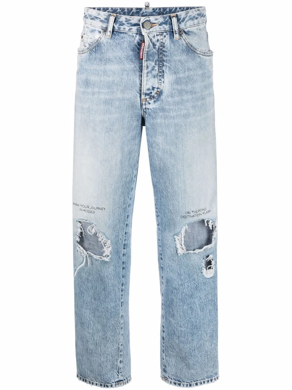 distressed straight-leg jeans blue navy cotton acid wash ripped detailing high-waisted cropped leg straight leg logo patch to the rear belt loops front button and zip fastening classic five pockets Made in Italy Composition Outer: Cotton 100% Lining: Polyester 65%, Cotton 35% SIZE & FIT Model measurements Height 5 ft 10 in(1.77 m) Bust/Chest 35.03 in(89 cm) Hips 35.03 in(89 cm) Waist 23.62 in(60 cm) FittingInformation This piece fits true to size. We recommend you get your regular size Designed to be fitted at the waist and hips, loose over the leg Made with a mid-weight non-stretch fabric Washing instructions Hand Wash