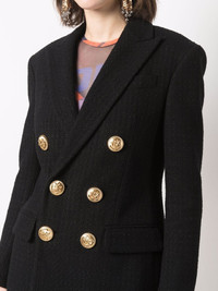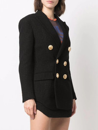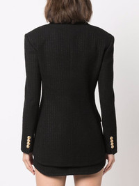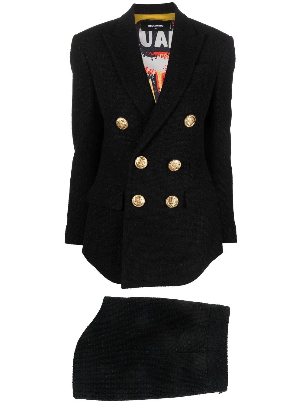 double-breasted skirt suit black set of two Jacket: double-breasted button fastening embossed gold-tone buttons peak lapels two front flap pockets chest welt pocket long sleeves buttoned cuffs asymmetric hem Skirt: high-waisted asymmetric hem thigh-high Made in Italy Composition Outer: Cotton 48%, Viscose 28%, Polyacrylic 18%, Other fibres 4%, Polyester 2% Lining: Polyester 100% SIZE & FIT Model measurements Height 5 ft 10 in(1.77 m) Bust/Chest 35.03 in(89 cm) Hips 35.03 in(89 cm) Waist 23.62 in(60 cm) FittingInformation This piece fits true to size. We recommend you get your regular size Cut for a slim fit Made with a mid-weight non-stretch fabric Washing instructions Dry Clean Only