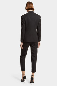 - PRODUCT ID: S75FT0259S76498900 - WOOL BLEND SUIT - SILK BLEND SATIN ELEMENTS - BLAZER: - PEAK LAPEL - DOUBLE BREASTED WITH LINED BUTTONS - TWO FLAPPED POCKETS - BREAST POCKET - INNER LINING - TROUSERS: - CREASED - HIDDEN HOOK WAISTBAND - SLIT POCKETS - TURN-UP CUFFS - FIT: SLIM - MADE IN ITALY FABRIC 1: 55% POLYESTER, 45% VIRGIN WOOL FABRIC 2: 52% SILK, 48% ACETATE LINING: 100% POLYESTER These double-breasted jacket and cigarette pants are shaped to the female form, enhancing the silhouette. A set that can be worn both during the day and for special evenings. Best to add accessories with colorful details.