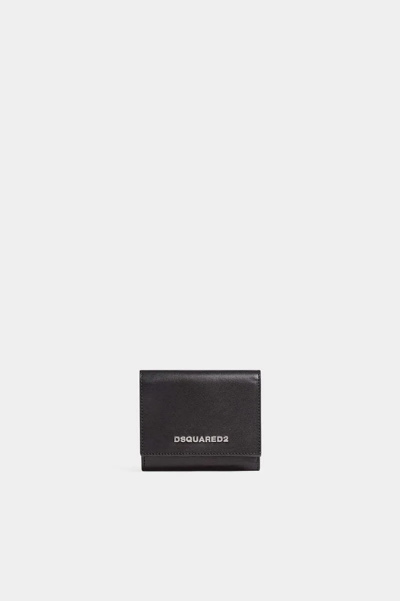 - PRODUCT ID : WAW0040015000012124UN - MADE FROM LEATHER - SIX CARD SLOTS - SNAP BUTTON COIN POCKET - METAL DSQUARED2 LOGO EXT MATERIAL COMP: 100% CALF LEATHER; LINING: 100% POLYESTER; ACC COMP: 100% ZAMAK Small, compact and super-sleek. This trifold wallet is crafted from soft black leather, featuring multiple inside card slots. Embellished with metal Dsquared2 lettering across the front for a chic finish.