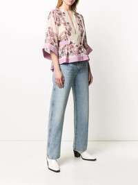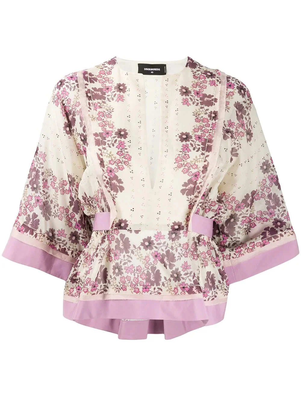 floral print blouse There's never a wrong time for florals. DSQUARED2 presents this ecru and fuchsia cotton floral print blouse boasting a tie waist. Fresh and feminine. Featuring a round neck, a slit at the chest, three-quarter length sleeves and a tie waist. Made in Italy Composition Outer: Cotton 77%, Silk 23% Lining: Cotton 100% Washing instructions Hand Wash