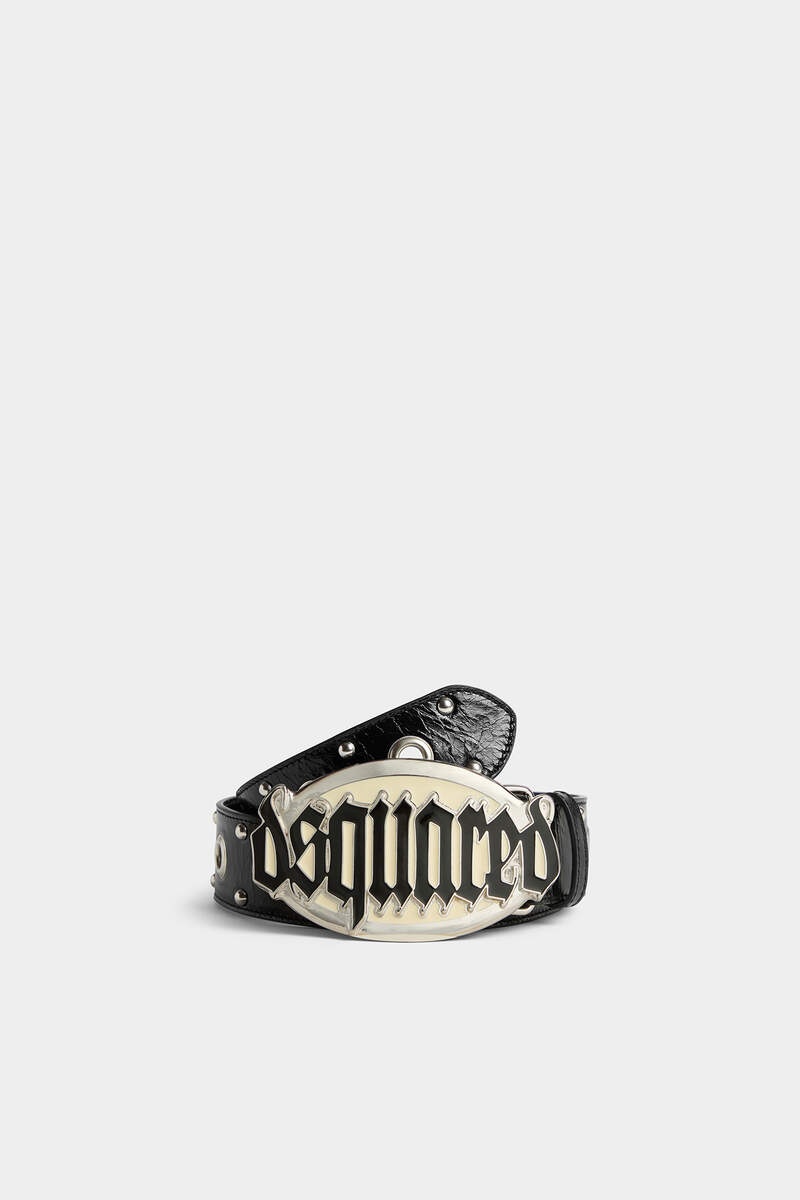 - PRODUCT ID: BEW0406015000012124 - LEATHER BELT WITH HOLLOW OUT RIVETS - ENAMELLED METAL LOGO BUCKLE - SIZE: HIGH CM 4, LONG FROM CM 60 TO CM 105 - MADE IN ITALY ROD COMP: 100% COW LEATHER/ BUCKLE COMP: 100% ZAMA The enamelled metal buckle immediately draws attention to this Dsquared2 leather belt. It is an accessory that can determine the success of an entire look. The suggestion is to pair this gothic-style design with jeans or leather pants.