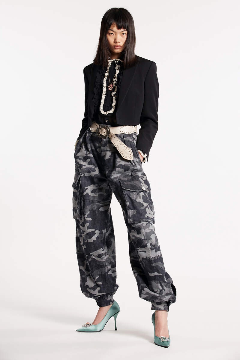- PRODUCT ID: S75KB0345S30357900 - STRETCH COTTON DENIM CARGO PANTS - ALL-OVER CAMOUFLAGE PRINT - FRONT PLEATS - BAGGY CUT - MULTI-POCKET STYLE - CONCEALED ZIP FLY AND BUTTON CLOSURE - LOGO TAG ON THE FLY - BUTTONED ANKLE CUFFS - REAR LOOP - LEATHER LOGO PATCH - MADE IN ITALY 98% COTTON, 2% ELASTANE-SPANDEX. POCKET LINING: 65% POLYESTER, 35% COTTON. DETAIL: 100% LEATHER