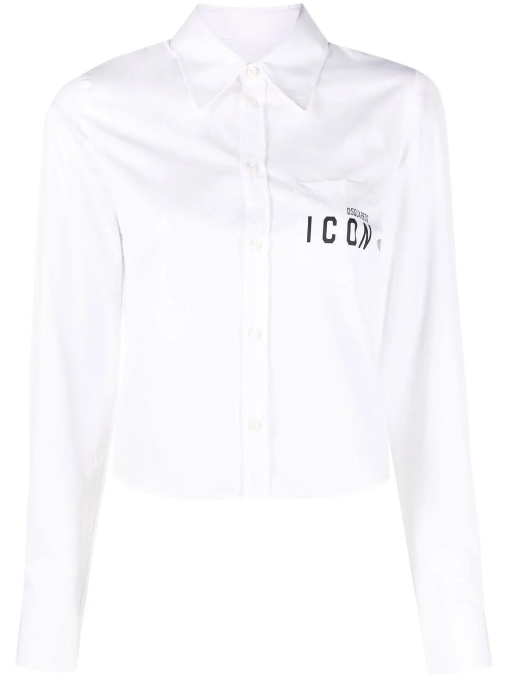 Icon print cropped cotton shirt A recognisable stamp of the streetwear brand Dsquared2, the Icon motif is seen at the chest of this cropped cotton shirt for a statement finish. Made in Italy Composition Cotton 100% SIZE & FIT Model measurements Height 5 ft 10 in(1.78 m) Bust/Chest 29.92 in(76 cm) Hips 34.64 in(88 cm) Waist 23.62 in(60 cm) FittingInformation This piece fits true to size. We recommend you get your regular size Cut for a loose fit Made with a mid-weight non-stretch fabric Washing instructions Dry Clean Only