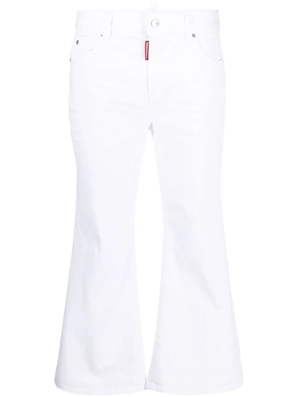White Bull cropped jeans Highlights - White - Stretch-cotton - Logo patch to the rear - High-waisted - Belt loops - Concealed fly and button fastening - Logo tag - Cropped leg - Classic five pockets Made in Italy Composition Outer: Cotton 98%, Spandex/Elastane 2% Lining: Cotton 100% SIZE & FIT Model measurements Height 5 ft 11 in(1.8 m) Bust/Chest 31.49 in(80 cm) Hips 35.43 in(90 cm) Waist 24.4 in(62 cm) FittingInformation Designed with a flared hem, these trousers allow for a close fit at the waist with a slim fit over the leg and widening towards the hem Cropped in length Constructed from stretch denim, this piece offers a stretch fit with durability This piece fits true to size – take your usual size Washing instructions Machine Wash