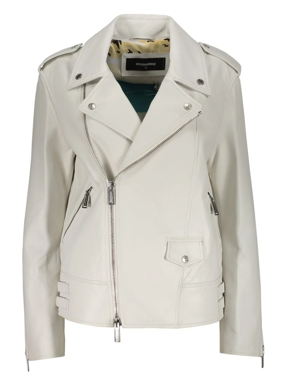 leather jacket Highlights - Ecru - Off-centre front zip fastening - Two side zip-fastening pockets - Cuff zips - Adjustable side straps Imported Composition Cotton 100%, Leather 100%, Polyester 100% SIZE & FIT FittingInformation Designed to be unstructured, offering a loose fit throughout Firm shearling has a treated construction offering some durability