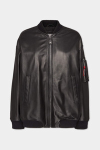 - MADE FROM LEATHER - ZIP CLOSURE - WELT POCKETS - UTILITY SLEEVE POCKET - RIBBED TRIMS PRIMARY FABRIC: 100% OVINE LEATHER; LINING: 100% POLYESTER; POCKET LINING: 100% COTTON Amp up the urban energy in this leather bomber jacket, styled with an oversized fit for an effortless throw-on-and-go look. Complete with a utility pocket on the sleeve with contrast Dsquared2 zip pull.