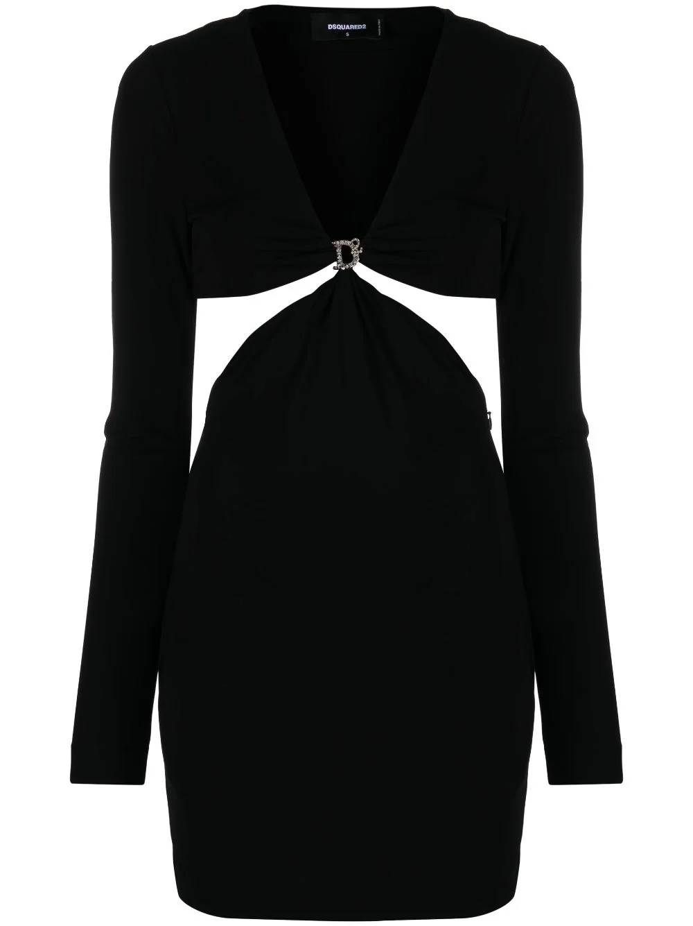 logo-embellished cut-out minidress A crystal-encrusted Dsquared2 emblem steals focus on this black minidress, acting as an anchor. The V-neck is balanced by geometric side cut-outs, which culminate in an open back and create the illusion of a two-piece silhouette. Highlights - Black - Crystal embellishment logo plaque - Cut-out detailing - V-neck - Long sleeves - Thigh-length Made in Italy Composition Viscose 100% SIZE & FIT Model measurements Height 5 ft 10 in(1.79 m) Bust/Chest 31.1 in(79 cm) Hips 35.03 in(89 cm) Waist 24.01 in(61 cm) FittingInformation Designed for a close fit throughout Made from a midweight non-stretch fabric, this piece offers minimal elasticity when worn This piece fits true to size – take your usual size Washing instructions Dry Clean Only