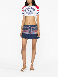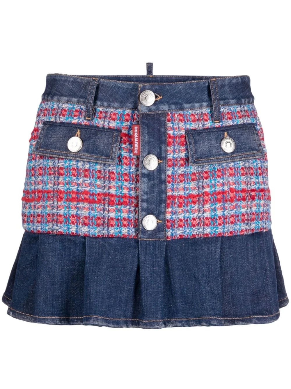 low-rise denim miniskirt Dsquared2’s denim miniskirt is a hybrid take on classic pleated styles. It’s cut to sit low on the waist and panelled with checked boucle. Highlights - Blue - Cotton blend - Denim - Boucle design - Panelled design - Check pattern - Pleat detailing - Low-rise - Belt loops - Front button fastening - Thigh-length Made in Italy Composition Cotton 63%, Polyester 16%, Acrylic 14%, other fibers 4%, Viscose 2%, Metallic Fibre 1% SIZE & FIT Model measurements Height 5 ft 10 in(1.78 m) Bust/Chest 31.49 in(80 cm) Hips 35.03 in(89 cm) Waist 23.62 in(60 cm) FittingInformation This mini-length skirt is intended to be worn just below the waist Made from a midweight fabric This piece fits true to size – take your usual size Washing instructions Hand Wash
