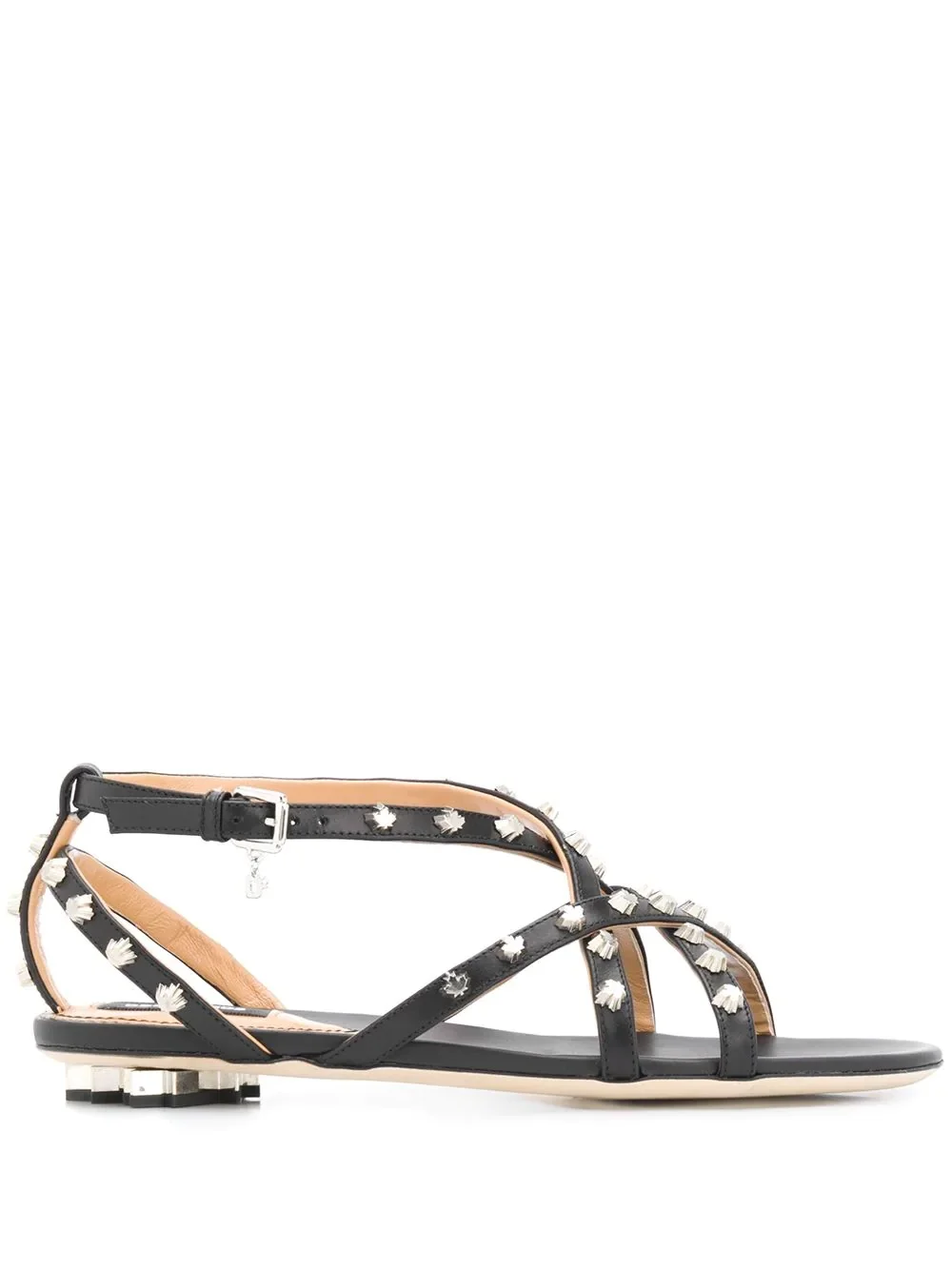 maple leaf studded flat sandals How patriotic are you? Constructed from supple leather, wear these maple leaf studded flat sandals from DSQUARED2 to show all your love and devotion for your homeland. Wear it proudly! Featuring an open toe, a branded insole, an ankle strap with a side buckle fastening, a strappy design, maple leaf shaped heel and maple leaf studded details. Made in Italy Composition Outer: Calf Leather 100% Lining: Calf Leather 100% Sole: Calf Leather 100% SIZE & FIT Measurement HEEL 0.78 in(2 cm)