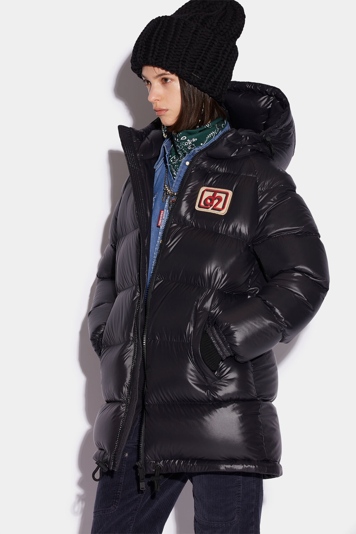 - PRODUCT ID: S72AM0990S60518900 - NYLON PUFFER COAT WITH STRIPED QUILTING - REGULAR FIT - STAND COLLAR WITH DRAWSTRING HOOD - TWO-WAY ZIP CLOSURE - SIDE ZIP WELT POCKETS - RIBBED CUFFS - EMBROIDERED "D2" PATCH ON THE CHEST - MADE IN CHINA PRIMARY FABRIC: 100% POLYAMIDE-NYLON. PADDING: 80% DUCK DOWN, 20% DUCK FEATHERS THE MODEL IS 5'10' TALL AND WEARS A SIZE 2 STRIKE AN URBAN NOTE IN THIS PACIFIC SPORTS PUFFER, CUT FROM SOLID COLOUR FABRIC WITH A GLOSSY FINISH. FEATURES TWO DIAGONALLY PLACED POCKETS ON THE FRONT, QUILTING AND AN ADJUSTABLE DRAWCORD HEM. THE EMBROIDERED PATCH LOGO ON THE CHEST STAMPS THIS PIECE DSQUARED2.