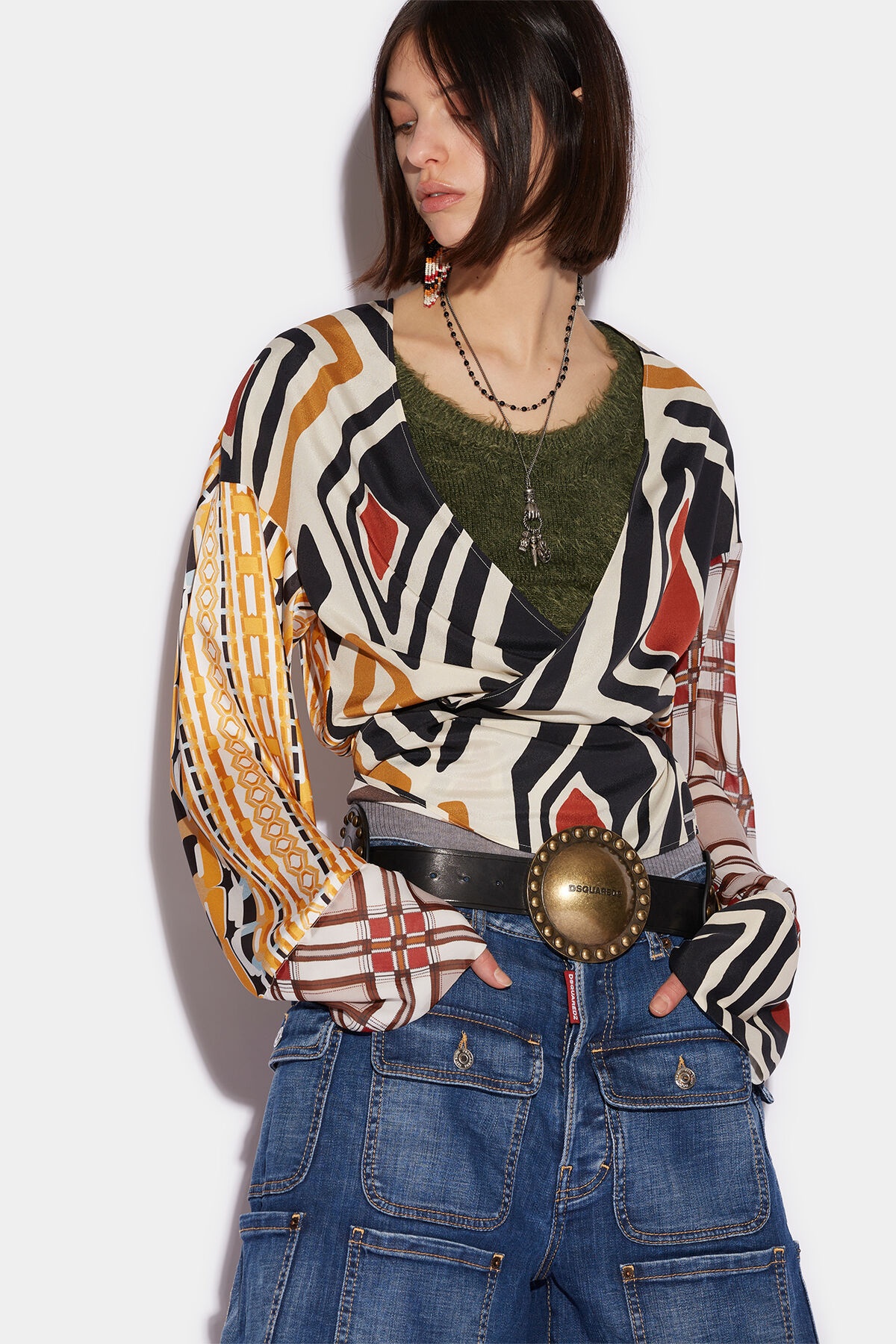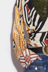 - PRODUCT ID: S72NC1003S60365001S - BLOUSE WITH GEOMETRIC PRINT - REGULAR FIT - V-NECK - LONG WIDE SLEEVES - WRAP STYLE WITH WAIST TIES - MADE IN ITALY 100% POLYESTER THE MODEL IS 5'10' TALL AND WEARS A SIZE 2 THANKS TO ITS EARTH-TONES, THE PACIFIC TOP IS BANG ON THE 70S-INSPIRED TREND. THIS WRAP-AROUND TOP BY DSQUARED2 IS PERFECT FOR LAYERING ON TOP OF YOUR FAVOURITE OUTFIT TO ADD A HIPPY VIBE. PLUS, THE BUSY PATTERN IS SURE TO DRAW THE EYE.