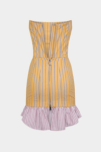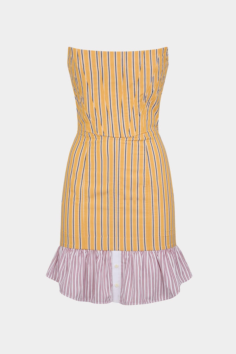 ● PRODUCT ID: S72CV0529D35002001F ● YARN-DYED STRIPED COTTON STRAPLESS DRESS ● CONTRASTING FLOUNCE SEWN AT THE BOTTOM ● BUSTIER BODICE ● DOUBLE TAB ZIP SEWN AT THE CENTRE BACK ● SLIM FIT ● MADE IN ITALY ● FABRIC: 100% COTTON The strapless dress in striped fabric reveals a touch of originality and style for special occasions. The gathered ruffle at the bottom adds movement and lightness. At this point it is important to know how to play with accessories: a leather belt clutch, jewelled sandals and coordinated jewellery.