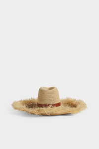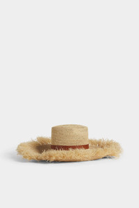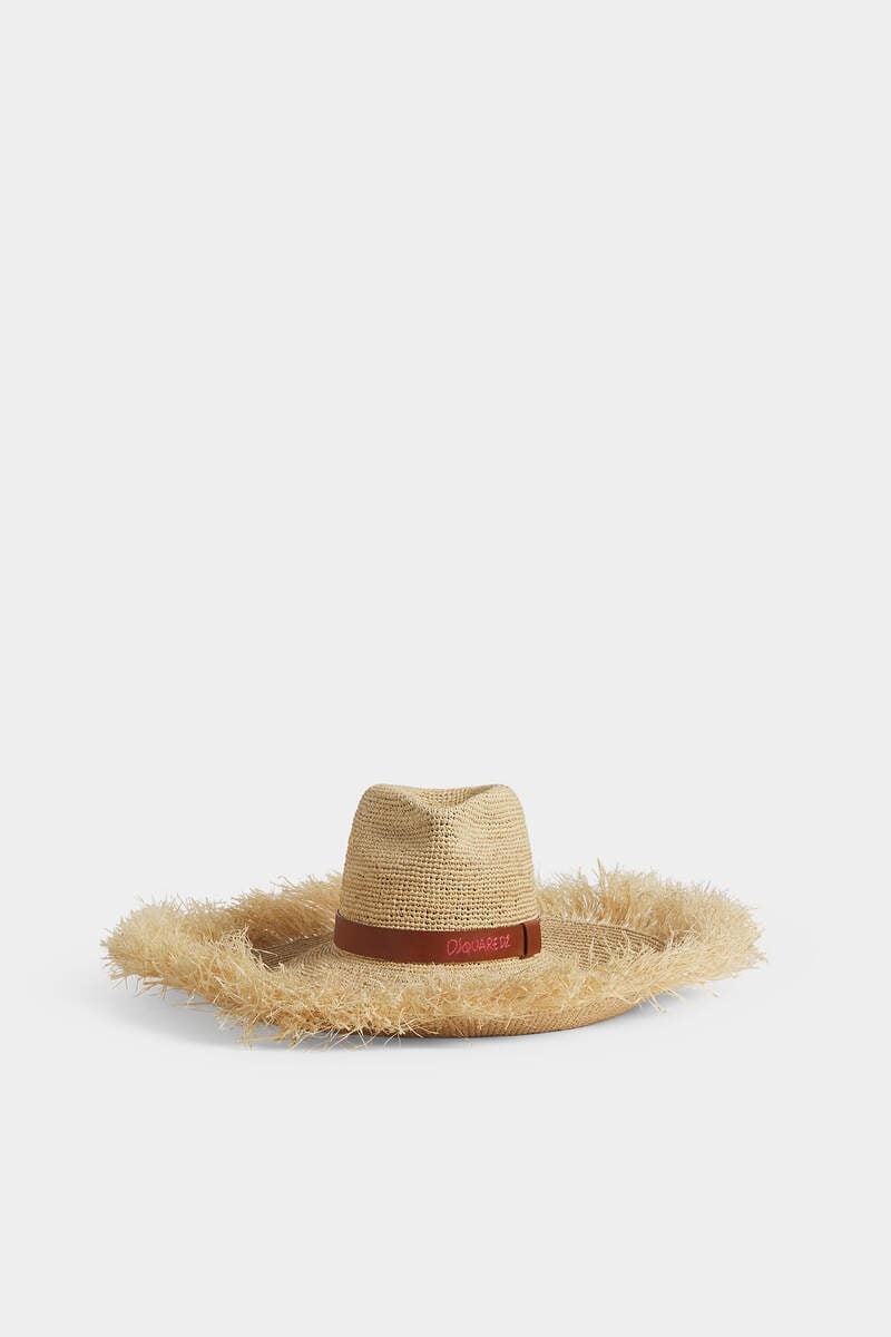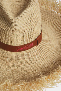 - PRODUCT ID : HAW0050289000015089 - MADE FROM RAFFIA - WIDE-BRIM SILHOUETTE - FRAYED EDGE - LEATHER BAND - EMBROIDERED DSQUARED2 LETTERING 100% RAFFIA This raffia hat is the epitome of summer-chic, bringing a hint of drama to holiday ensembles with its wide-brim silhouette and frayed edge. Finished with a refined leather band, embroidered with Dsquared2 lettering.