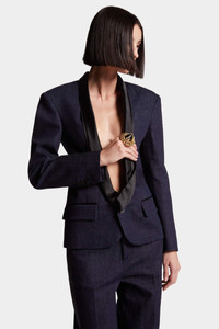 S72BN0684S30664470 - STRETCH DENIM BLAZER - SILK SATIN DETAILS - SHAWL LAPEL - FIT: SLIM - SATIN-LINED SINGLE BUTTON - TWO FLAPPED POCKETS - DOUBLE VENT - INNER LINING - MADE IN ITALY FABRIC 1: 99% COTTON , 1% ELASTANE-SPANDEX FABRIC 2: 100% SILK Formal events are lit up with elegant originality thanks to this distinctive single button evening jacket. The shimmer interplay is focused on the satin shawl lapel. Fit suggests to match it with satin slouchy pants or leather leggings.