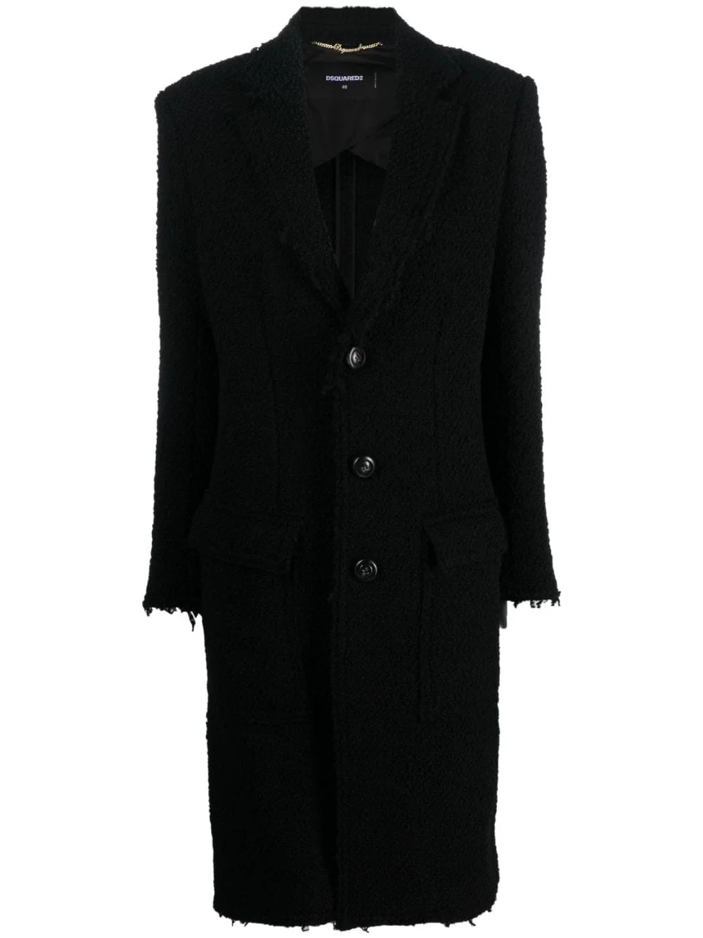 single-breasted boucle coat Highlights - Black - Virgin wool blend - Boucle construction - Notched lapels - Front button fastening - Long sleeves - Buttoned cuffs - Two front flap pockets - Central rear vent - Straight hem - Long length - Unlined Made in Italy Composition Outer: Virgin Wool 83%, Polyamide 17% Lining: Viscose 100% SIZE & FIT Model measurements Height 5 ft 11 in(1.8 m) Bust/Chest 33.07 in(84 cm) Hips 37.4 in(95 cm) Waist 25.19 in(64 cm) FittingInformation Designed to be unstructured, offering a loose fit throughout The internal shoulder pads offer a structured shape Made from a midweight non-stretch fabric This piece fits true to size – take your usual size Washing instructions Dry Clean Only