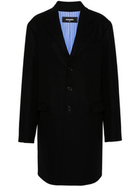 single-breasted coat Highlights - Black - Virgin wool blend - Felted finish - Notched lapels - Front button fastening - Long sleeves with buttoned cuffs - Chest welt pocket - Two front flap pockets - American rear vent - Straight hem - Thigh-length - Striped lining Made in Italy Composition Outer: Virgin Wool 79%, Polyamide 20%, Spandex/Elastane 1% Lining: Cotton 100% SIZE & FIT Model measurements Height 5 ft 10 in(1.77 m) Bust/Chest 32.28 in(82 cm) Hips 35.03 in(89 cm) Waist 25.19 in(64 cm) FittingInformation Designed to be unstructured, offering a loose fit throughout The vented hem offers movement at the rear Made from a midweight non-stretch fabric This piece fits true to size – take your usual size