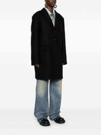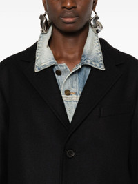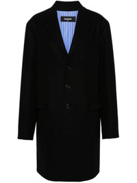 black virgin wool blend felted finish notched lapels front button fastening long sleeves with buttoned cuffs chest welt pocket two front flap pockets American rear vent straight hem thigh-length striped lining Size & Fit Model Measurements: Height: 1.76 m Bust/Chest: 82.0 cm Hips: 89.0 cm Waist: 63.0 cm Model wears size 40 Fabric and Care Designer Style ID: S75AA0415S53003 Designer Colour: 900 BLACK Composition: Outer: Virgin wool 79%, Polyamide 20%, Spandex/elastane 1%; Lining: Cotton 100% Washing instructions: Dry Clean Only Made in Italy
