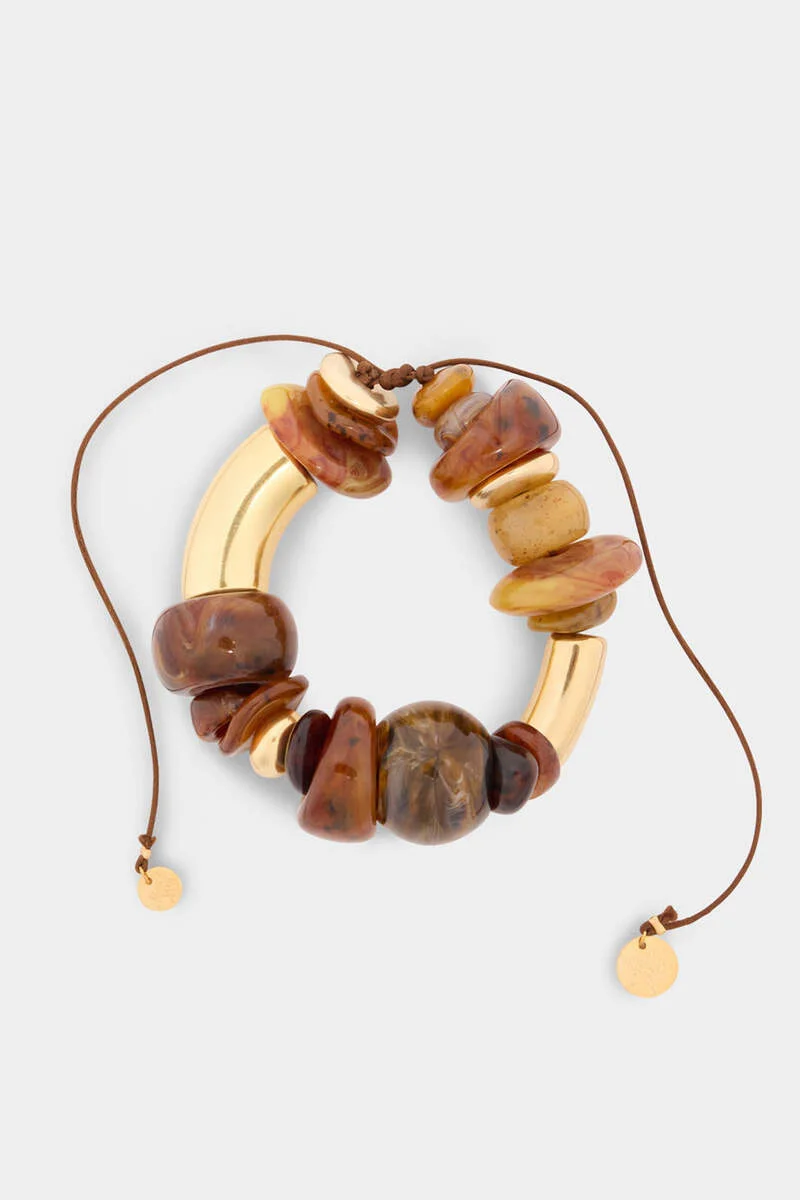 - PRODUCT ID : ANW001534303746M726UN - MADE FROM BRASS AND LEATHER - LACE-UP CLOSURE BUCKLE COMP: 100% BRASS; 100% COW LEATHER; ACCESSORY: 100% BRASS; OTHER ACCESSORY: 100% RESINS Featuring an eclectic mix of beads in varied shapes and materials, this anklet brings playful texture and bold detailing to any outfit. Perfectly styled with shorts or barefoot by the beach.