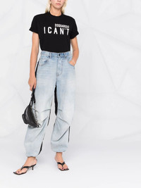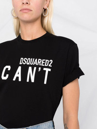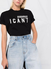 slogan-print T-shirt black cotton slogan print logo print to the front round neck short sleeves straight hem Made in Italy Composition Cotton 100% SIZE & FIT Model measurements Height 5 ft 10 in(1.79 m) Bust/Chest 31.49 in(80 cm) Hips 35.03 in(89 cm) Waist 24.01 in(61 cm) FittingInformation This piece fits true to size. We recommend you get your regular size Cut for a relaxed fit Made with a mid-weight fabric Washing instructions Machine Wash