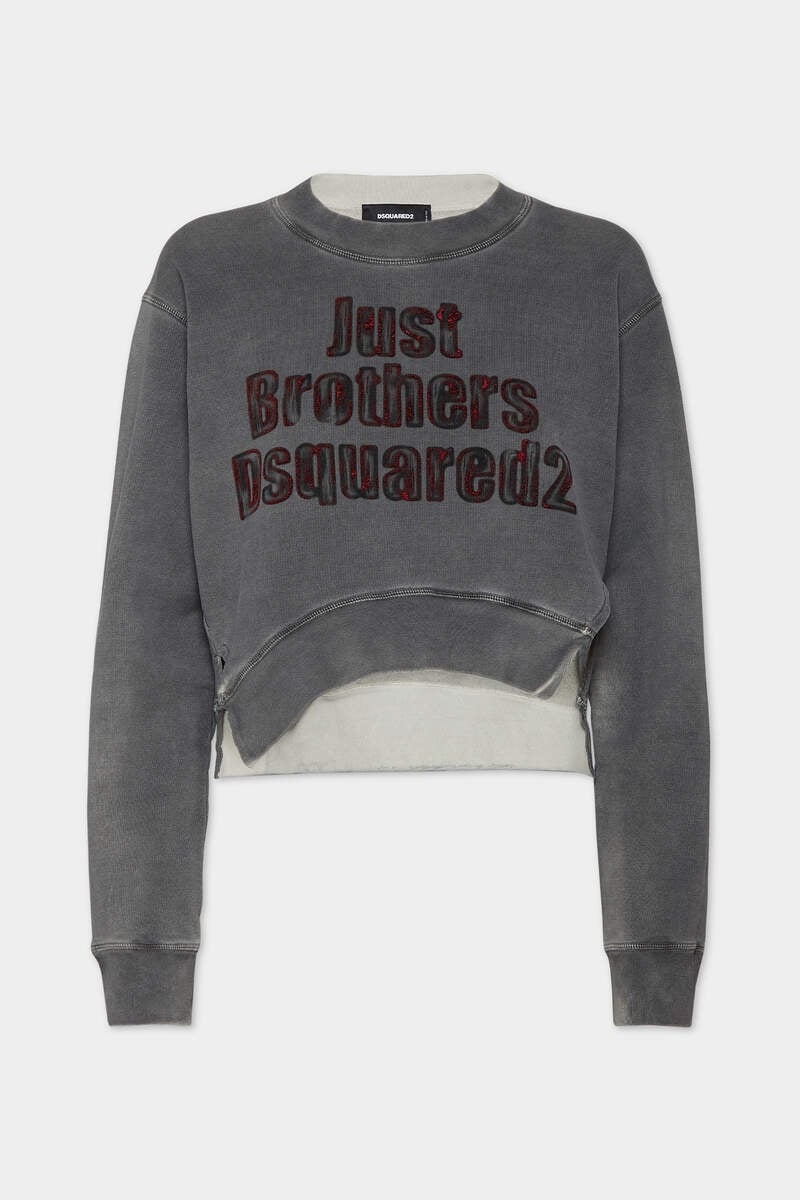 - MADE FROM UNBRUSHED COTTON FLEECE - SPRAY-DYED - ASYMMETRICAL CROPPED FIT - CREW NECK - SIDE SLIT - RIBBED TRIMS - JUST BROTHERS DSQUARED2 PRINT PRIMARY FABRIC: 100% COTTON; SECONDARY FABRIC: 99% COTTON, 1% ELASTANE-SPANDEX An asymmetrical cropped fit and a faded wash: this slogan sweatshirt screams throw-on-and-go attitude, celebrating our founders and twin brothers Dean and Dan. Team with white sneakers and jeans for an easy off-duty look.