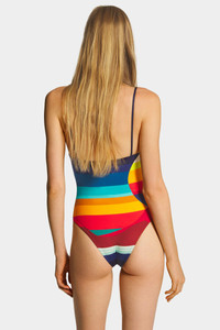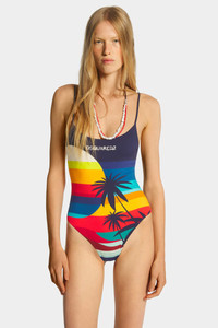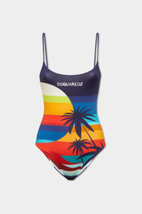 - PRODUCT ID : D6BG65210ISA01998 - MADE FROM STRETCH NYLON - STRIPED PATTERN - TROPICAL PALM TREE DESIGN - SCOOP NECK - THIN STRAPS 80% POLYAMIDE/NYLON, 20% ELASTANE Embrace the tropical vibes in this one-piece swimsuit, flaunting a striped design in sunset and ocean hues. Its sleek silhouette has been designed to be universally flattering, styled with a scoop neck, straight back and spaghetti straps.