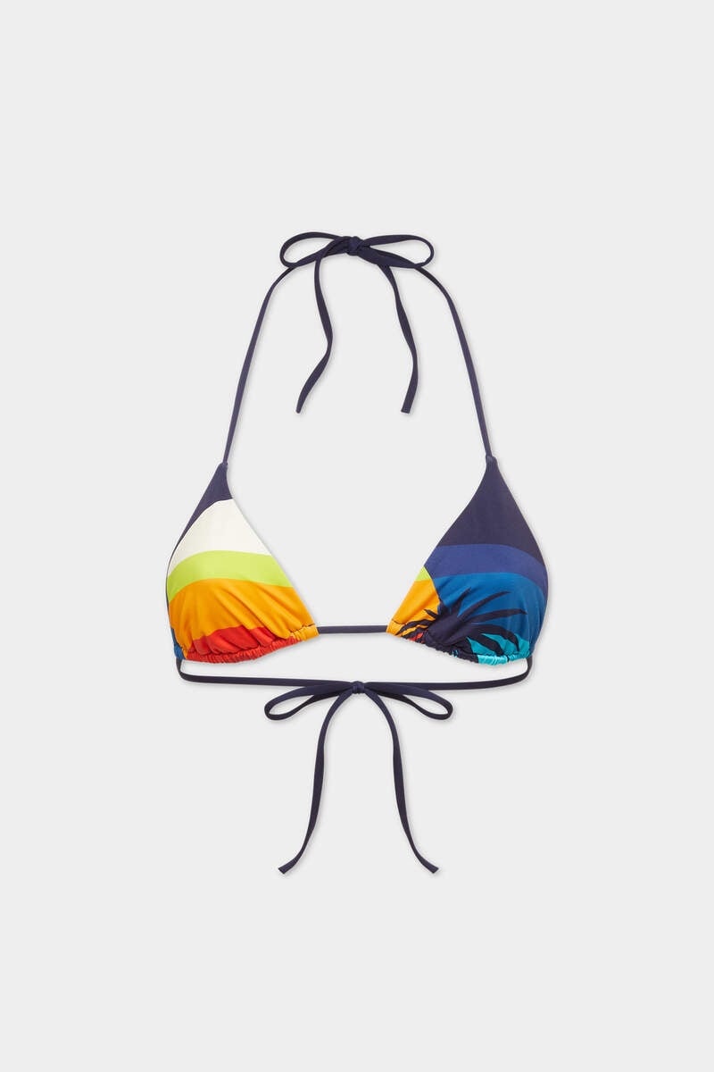 - PRODUCT ID : D6BX65210ISA01998 - MADE FROM STRETCH NYLON - STRIPED PATTERN - TROPICAL PALM TREE DESIGN - TRIANGLE STYLE - ADJUSTABLE STRAPS 80% POLYAMIDE/NYLON, 20% ELASTANE Nothing says summer like this bikini top, flaunting a striped design in sunset and ocean hues with a tropical palm tree print. Its triangle silhouette has been designed to be universally flattering, styled with adjustable straps at the neck and back.
