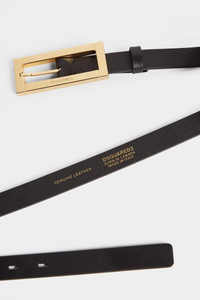 - PRODUCT ID : BEW044411300001M1159 - MADE FROM LEATHER - GLOSSY METAL RECTANGULAR BUCKLE - ENGRAVED DSQUARED2 LOGO 100% COW LEATHER; BUCKLE COMP: 100% BRASS; ACC COMP: 100% BRASS; OTHER ACC 1: 100% RESIN Keep it sleek in this slim leather belt, fastening with a rectangular metal buckle with subtle Dsquared2 lettering. Add to tailored trousers for an effortlessly elegant evening look.