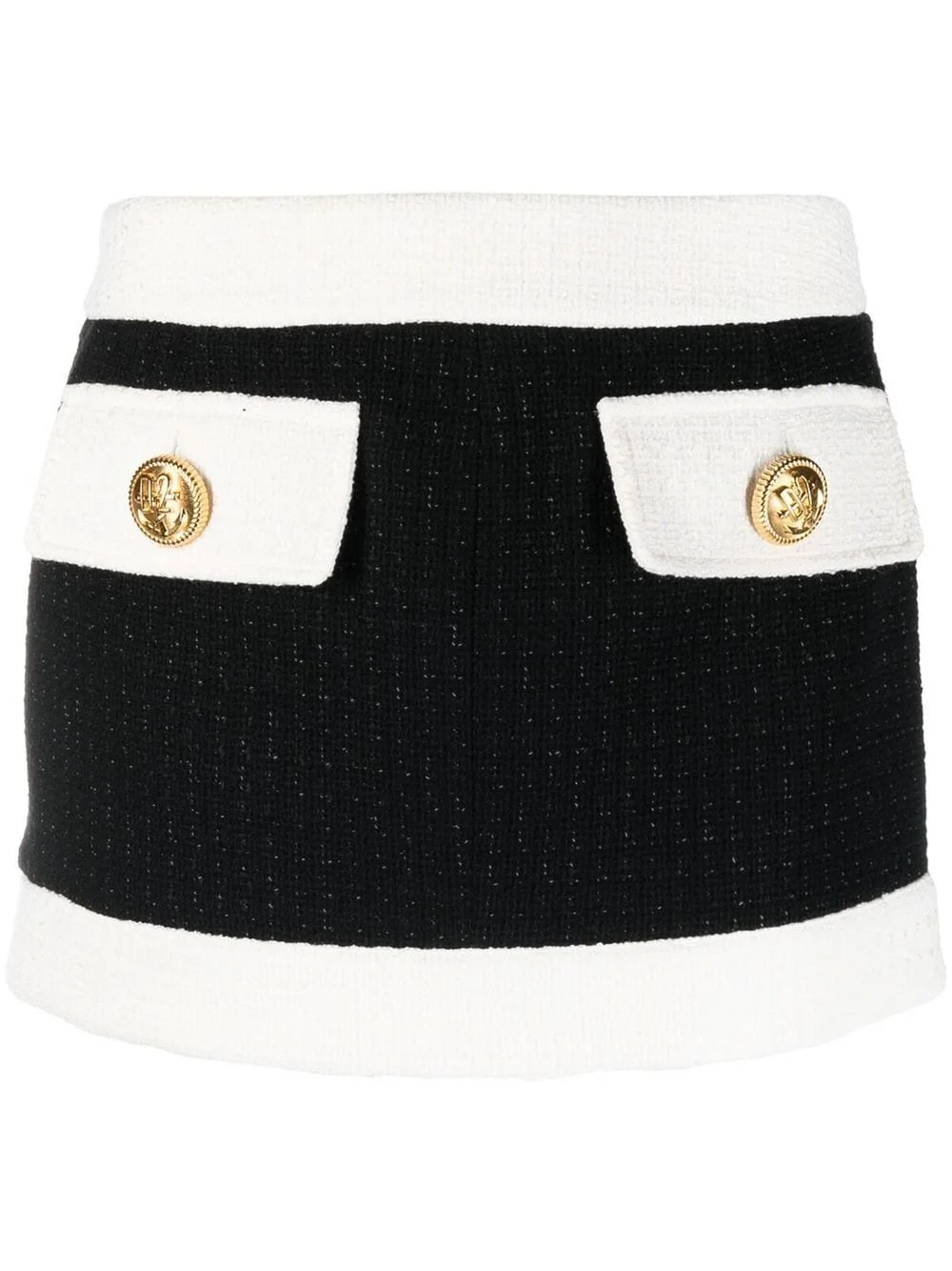 two-tone tweed miniskirt Crafted from a cotton blend in white and black tones, Dsquared2's miniskirt boasts a tweed construction. The low-rise piece is elegantly finished with embossed gold-tone buttons. Made in Italy Composition Outer: Cotton 48%, Viscose 28%, Acrylic 18%, Other fibres 4%, Polyester 2% Lining: Polyester 100% SIZE & FIT Model measurements Height 5 ft 10 in(1.78 m) Bust/Chest 31.49 in(80 cm) Hips 35.43 in(90 cm) Waist 24.4 in(62 cm) FittingInformation This piece fits true to size. We recommend you get your regular size Designed to be fitted at the waist and hips, loose over the leg Made with a mid-weight non-stretch fabric Washing instructions Dry Clean Only