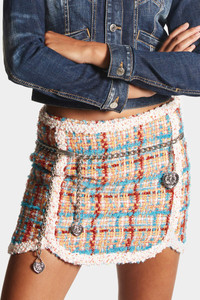 ● PRODUCT ID: S75MA0918S78513001F ● CHECKED MINISKIRT IN YARN-DYED MIXED-FIBRE FABRIC ● BOUCLÈ TRIMS ● CHAIN WITH LOGO SEWN ON THE BACK ● INVISIBLE ZIP FASTENING ON THE SIDE ● ROUNDED HEM ● REGULAR FIT ● MADE IN ITALY ● FABRIC: 97% POLYESTER, 14% COTTON, 7% ACRYLIC, 5% WOOL, 2% ALPACA, 2% MOHAIR The mini skirt is always a must for grabbing attention. This bon-ton version that Dsquared2 has created is a tribute to the style of the '60s. The style with the passementerie trim suggests combining with the jacket in the same checked bouclé fabric. But nothing's stopping you from wearing a cropped top to highlight your waist. 12cm heel sandals are essential.
