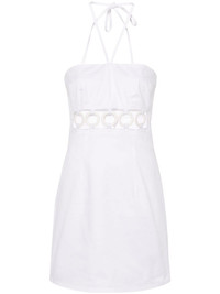 Woodstock denim minidress Highlights - White - Cotton blend - Denim - Cut-out detailing - Ring embellishment - Sweetheart neck - Halterneck tie fastening - Rear zip fastening - Slim cut - Straight hem - Thigh-length Made in Italy Composition Outer: Acrylic 100%, Cotton 97%, Elastane 3% Lining: Cotton 100% SIZE & FIT Model measurements Height 5 ft 10 in(1.78 m) Bust/Chest 33.07 in(84 cm) Hips 36.61 in(93 cm) Waist 24.8 in(63 cm) FittingInformation Designed for a slim fit that sits just away from the body offering a close yet comfortable fit The dart stitching adds structure and a closer fit in the torso of this piece Made from a midweight stretch fabric, this piece offers elasticity and flexibility when worn This piece fits true to size – take your usual size