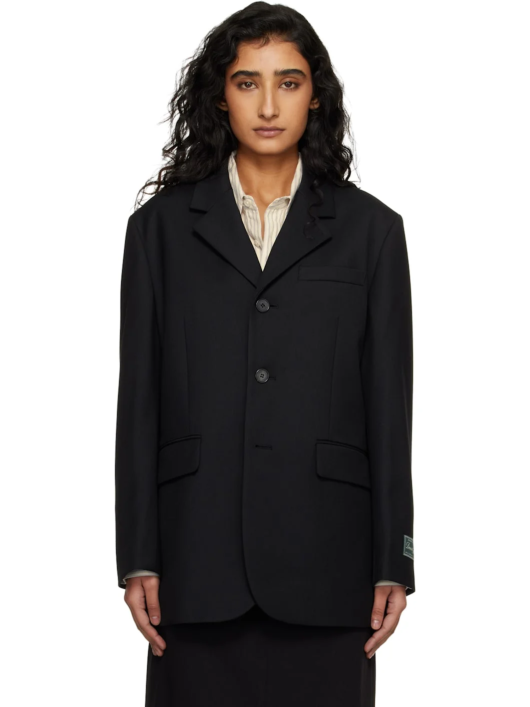 Wool-blend twill blazer. · Notched lapel · Button closure · Welt pocket at chest · Flap pockets at waist · Surgeon's cuffs · Logo patch at cuff · Central vent at back hem · Welt pocket at interior · Full satin lining Supplier color: Black Body 1: 58% wool, 42% polyester. Body 2: 100% polyester. Lining: 100% polyester. Made in Viet Nam 261965F057000