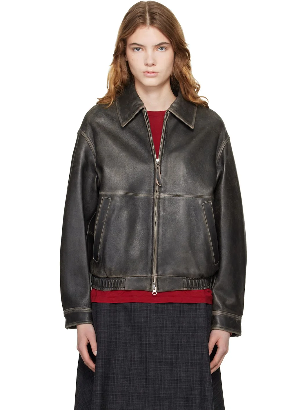 Buffed lambskin jacket. · Fading throughout · Paneled construction · Spread collar · Two-way zip closure · Welt pockets at waist · Partially elasticized hem · Pleat at adjustable press-stud barrel cuffs · Welt pocket at interior · Full satin lining Supplier color: Brushed black Body: 100% lambskin. Lining: 100% polyester. Made in China 261965F064000